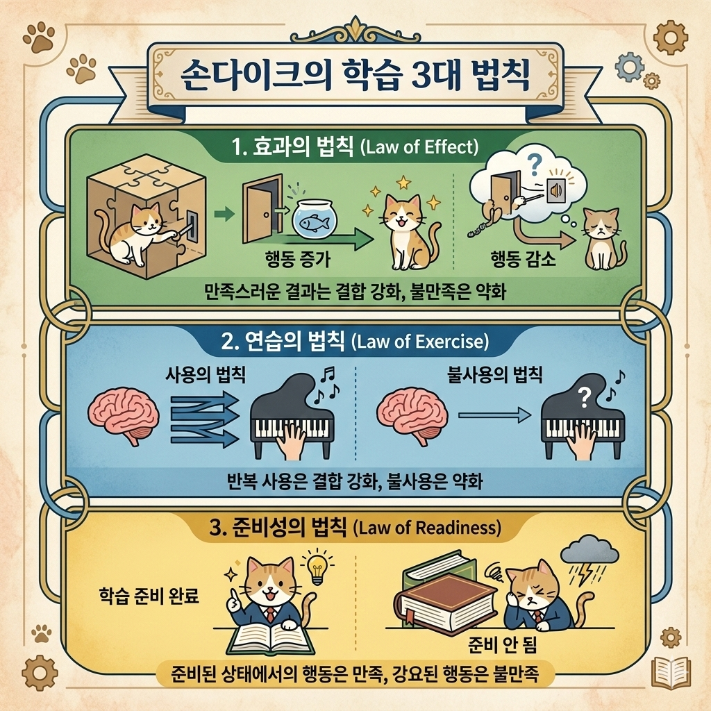 손다이크는 실험을 통해 학습이 일어나는 세 가지 주요 법칙을 제시했다.