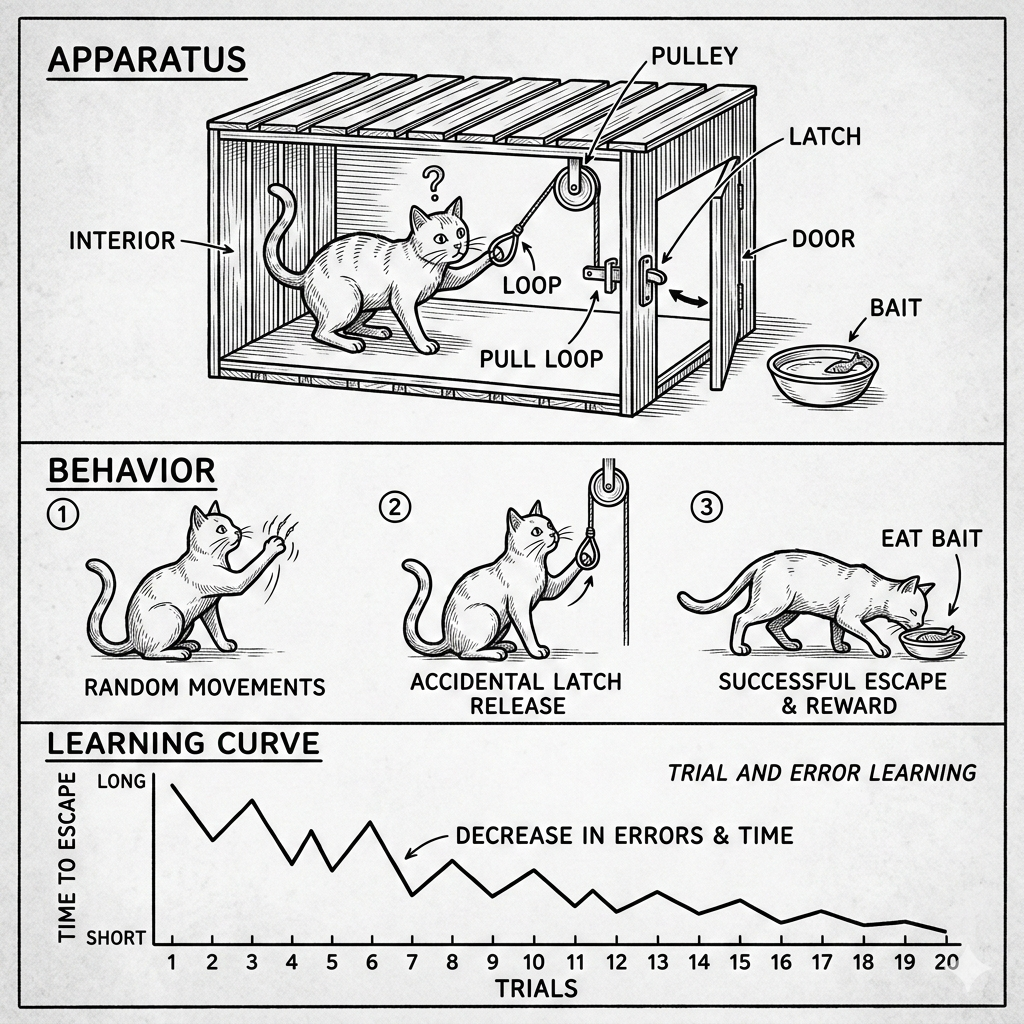 - 시행착오 학습(Trial and Error Learning): 고양이는 처음에 밖으로 나가기 위해 창살을 긁거나 몸을 비비는 등 온갖 무의미한 반응을 반복한다. 그러다 우연히 페달을 밟아 문을 열게 되고 음식을 먹는다. 이 과정을 여러 번 반복하면, 고양이는 불필요한 행동(오류)을 줄이고 페달을 밟는 성공적인 반응을 더 빨리 보이게 된다. 손다이크는 이 과정을 통해 학습이 한 번에 일어나는 것이 아니라 '시행과 착오'를 거쳐 점진적으로 이루어짐을 밝혔다.