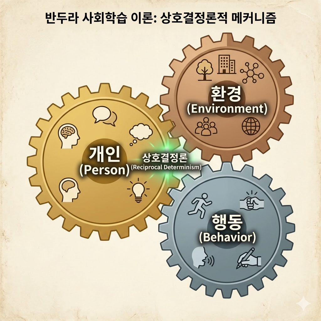 이 세 가지가 톱니바퀴처럼 맞물려 돌아간다는 것이 '상호결정론(Reciprocal Determinism)'의 골자다.