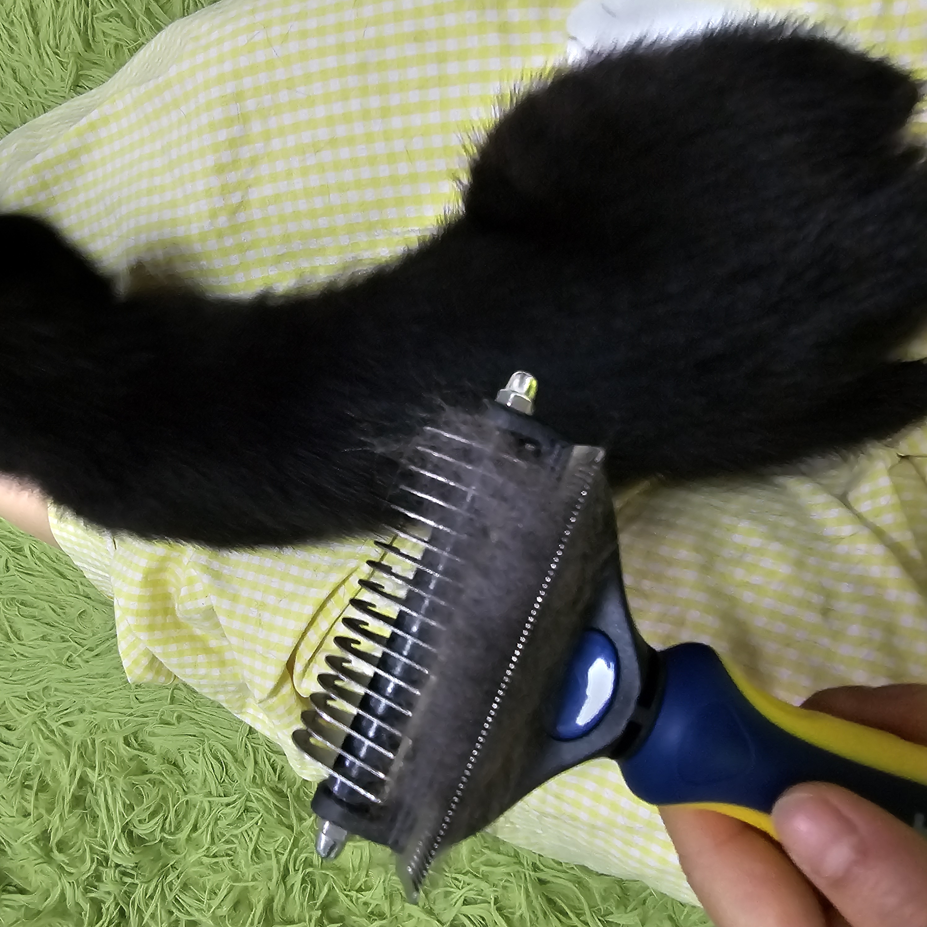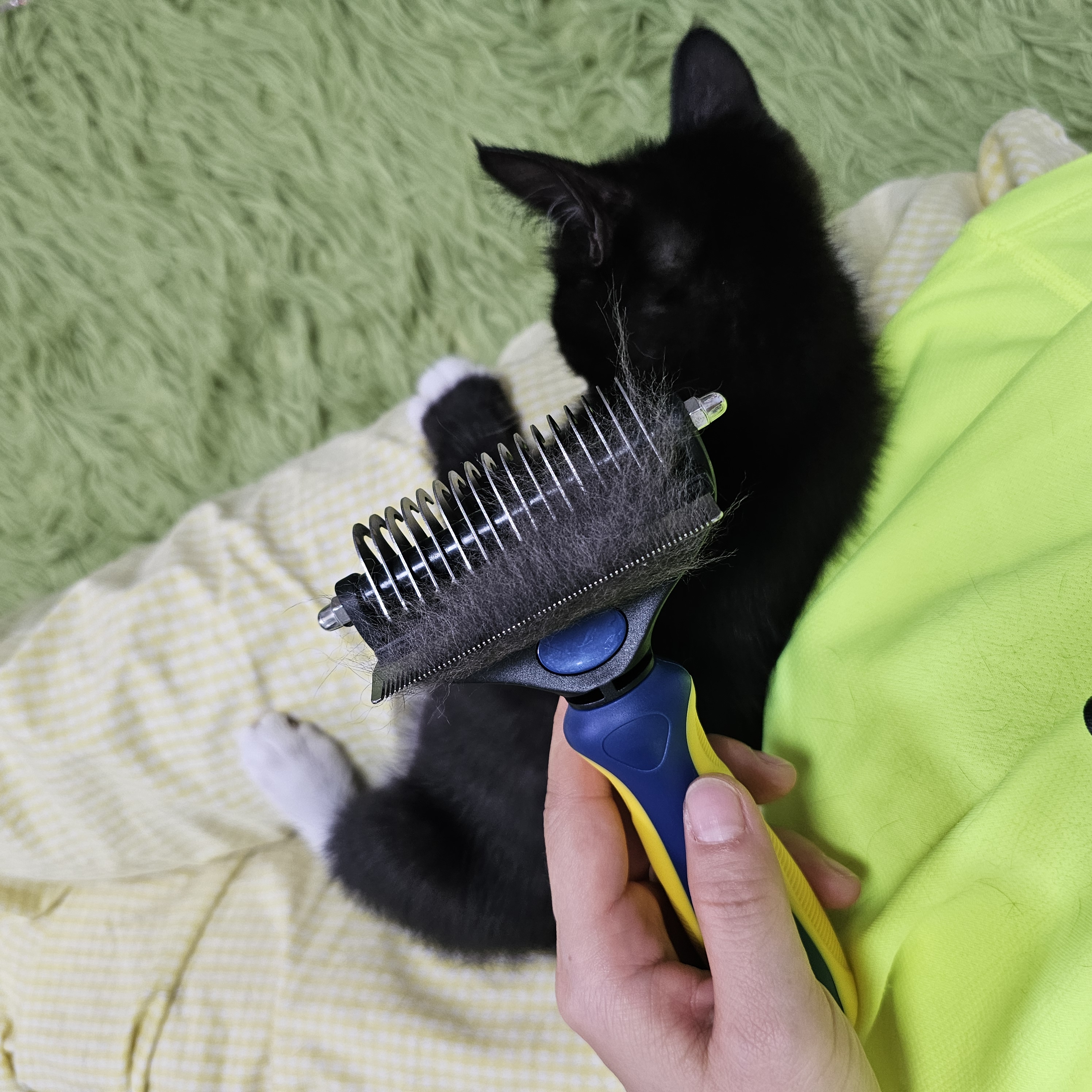 엉킨 털과 죽은 털을 관리해주는 브러쉬가 듀얼로 있어서 용도에 맞게 사용하면 되는데, 로우는 아직 어리고 단모종이라 죽은털 빗으로만 빗어주어도 충분히 효과를 볼 수 있어서 매우 만족스럽다.