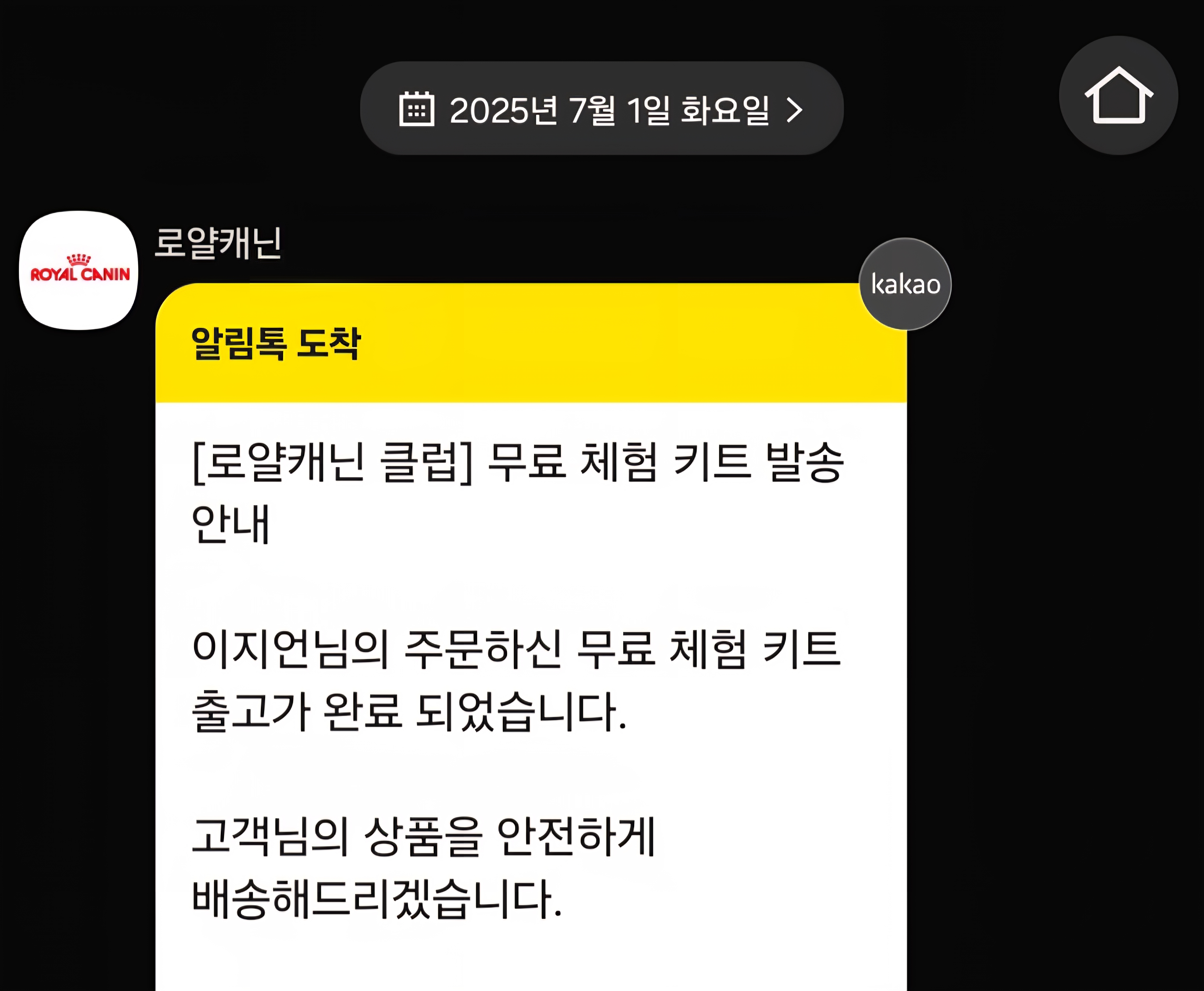 택배가 접수 되었다는 알림 톡과, 배송 완료 톡을 보내주는데 나의 경우 택배는 신청 하루 뒤에 받았고 알림톡은 그로부터 사흘 뒤에 받았다.