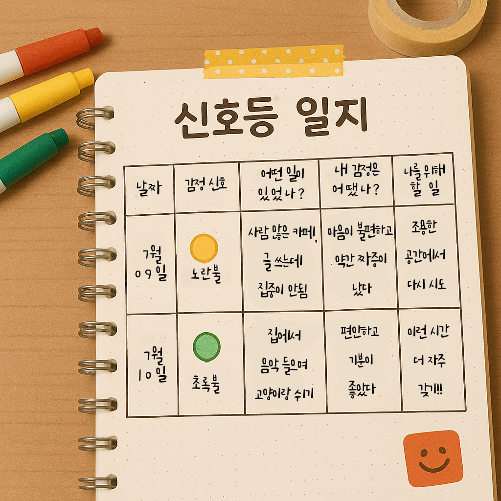 신호등 일지를 통해 나의 감정 신호를 정기적으로 확인하고, 몸과 마음의 균형을 살펴보자.